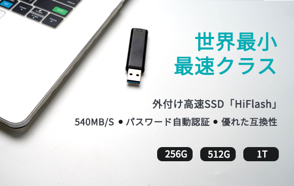 ① 世界最小&最速クラスのポータブルSSD「HiFlash」