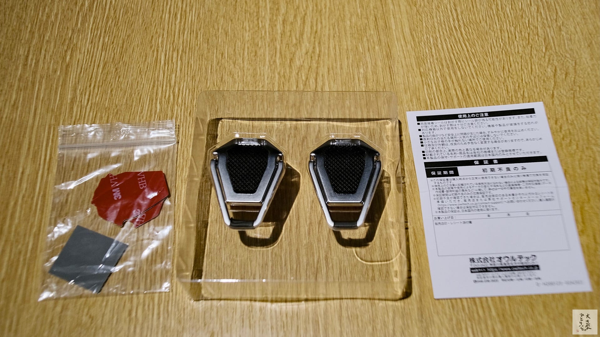 箱を開けると、予備の両面テープ、滑り止めパッド(4枚)、スタンド、保証書というシンプルな内容。滑り止めパッドと予備の両面テープが入ってるのが良心的ですな。