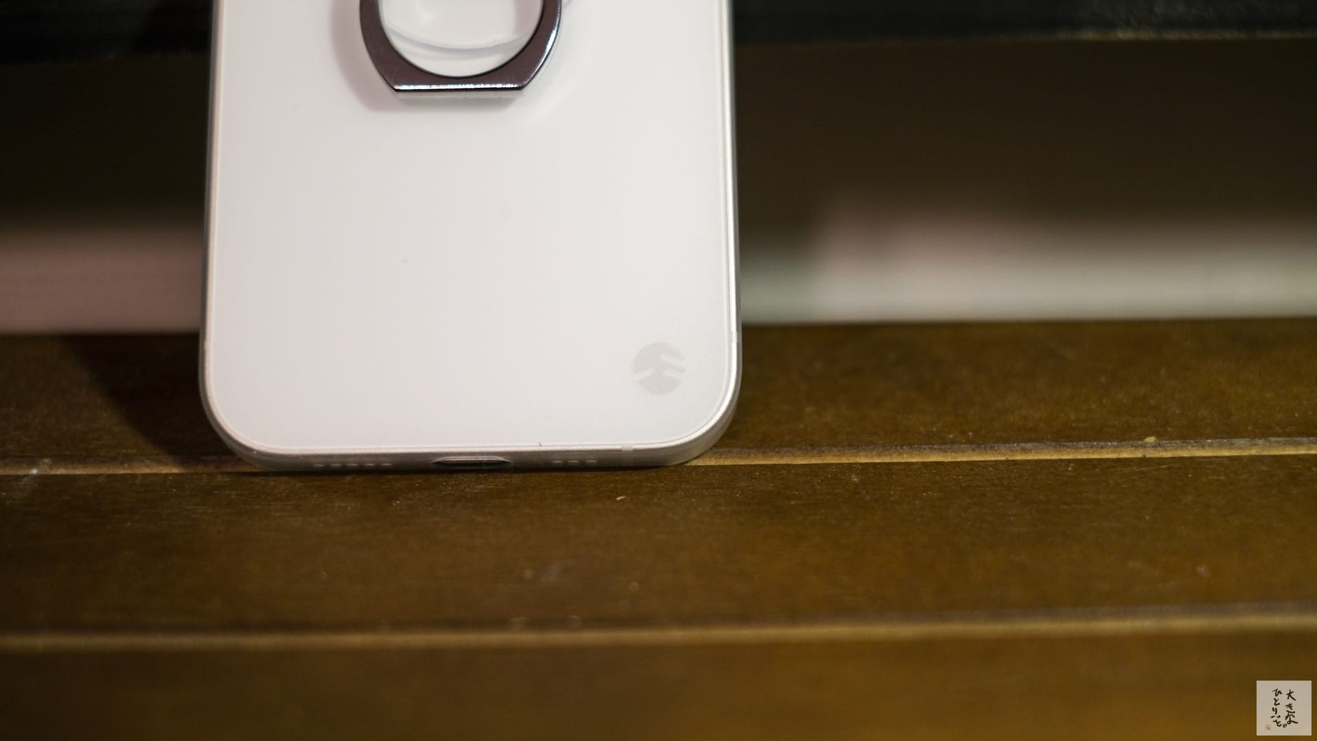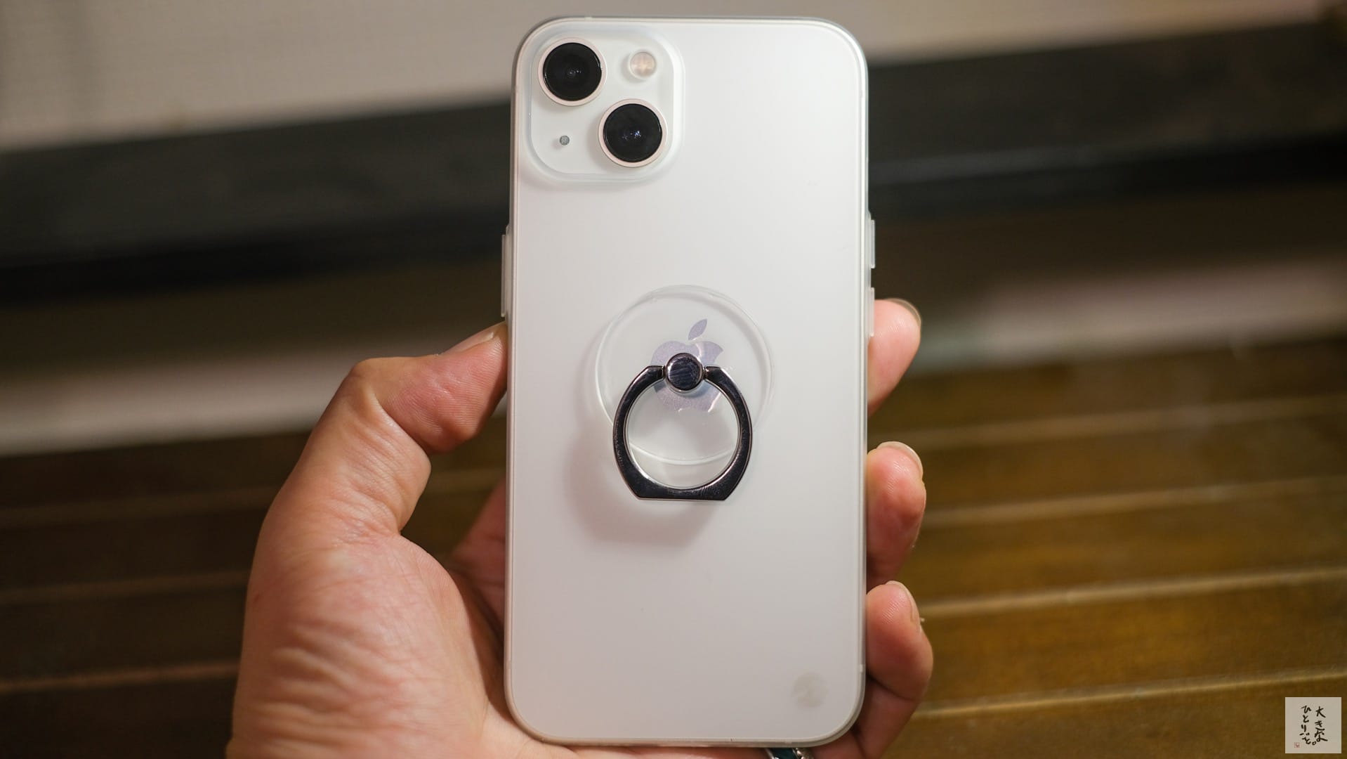 取り付けてみました。背面はちゃんとリンゴマークも見えます。ちなみに落としそうで怖かったので初のバンカーリングも取り付けました。