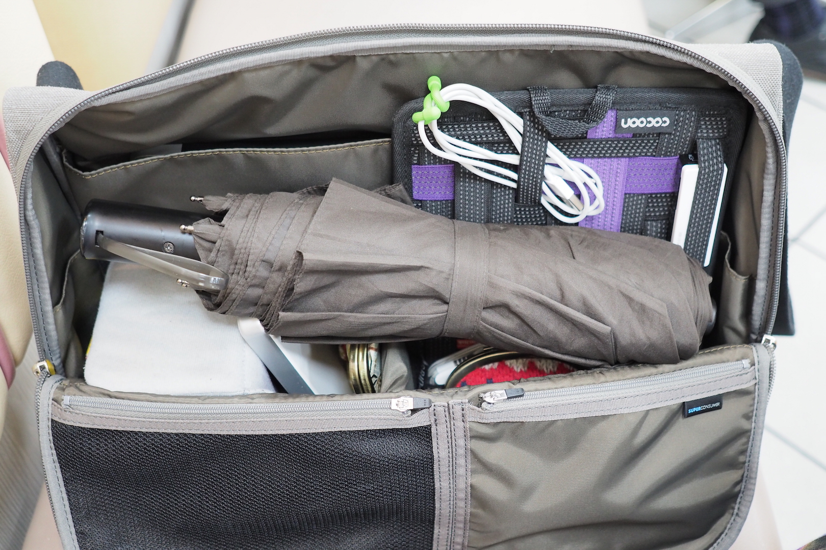 バッグの中はこんな感じになってます。折りたたみ傘はもう少し小さめで縦に入るサイズのが欲しいなー。緊急時に対応できる程度のでいいから。